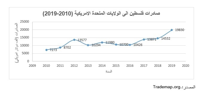 شهدت صادرات فلسطين إلى الولايات المتحدة زيادة مستمرة منذ عام 2010 حيث صدرت فلسطين 7.2 مليون دولار أمريكي إلى الولايات المتحدة الأمريكية. استمرت الصادرات في الزيادة لتصل إلى 10.7 مليون دولار أمريكي في عام 2015 ووصلت أخيرًا إلى 19.8 مليون دولار أمريكي في عام 2019. وفيما يتعلق بأهم منتجاتنا المصدرة إلى الولايات المتحدة الأمريكية، فإن زيت الزيتون والتمور هما أهم صادراتنا الثابتة في السوق. حيث صدرت فلسطين في عام 2019 ما قيمته 12 مليون دولار أمريكي من زيت الزيتون و2.5 مليون دولار أمريكي من التمور. وتشمل المنتجات الأخرى المصدرة أعشاب بقيمة 1.4 مليون دولار أمريكي. منتجات الحرف اليدوية تمتع برسوم جمركية صفرية عند الدخول إلى سوق الولايات المتحدة.