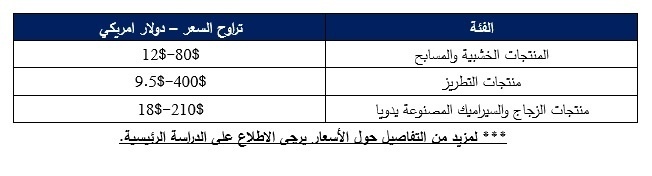منتجات الحرف اليدوية الفلسطينية التقليدية وتصاميمها تحظى بثمن جيد في السوق الأمريكية. ومع ذلك، فإن التصاميم العصرية لمنتجات الحرف اليدوية الفلسطينية تميل إلى تحقيق أسعار أعلى وزيادة في الطلب عليها. ويشمل ذلك مآزر المطبخ والوسائد والحقائب والأحذية ذات الزخارف المطرزة. أكثر بائعي الحرف اليدوية الفلسطينيين نجاحًا هم أولئك الذين يركزون على قصة لكل منتج لديهم، مع التركيز على المسؤولية الاجتماعية والتعويض العادل للنساء وصغار المنتجين، والذين يضيفون قيمة إلى منتجاتهم لجعلها أكثر حداثة وأكثر جذابة للمستهلكين الأمريكيين الشباب (أي جيل الألفية). لذلك، من أجل جذب منتجات الحرف اليدوية الفلسطينية التقليدية للمستهلكين الأمريكيين، من المهم تقديم تصميمات عصرية جديدة تظل تحمل قيم التراث والثقافة الفلسطينية ولكنها أيضًا ذات صلة بالمستهلكين الأمريكيين. على سبيل المثال بالنسبة للمنتجات الخشبية، فإن أواني المطبخ والأطباق والأوعية التي تحتوي على عناصر ثقافية فلسطينية تلقى طلب أكبر في السوق الأمريكية. من ناحية أخرى، عندما تباع المنتجات الخشبية الدينية بأسعار جيدة في السوق الأمريكية، فإنها تميل إلى استهداف شريحة معينة من المستهلكين الأمريكيين، وبالتالي لن يكون لها نفس مستويات الطلب مثل تلك الأكثر عصرية وذات صلة بقاعدة المستهلك بأكملها. أما بالنسبة لمنتجات السيراميك والزجاج، فإن تصميماتها ووظائفها الحالية تجعلها ذات صلة ومطلوبة في سوق الولايات المتحدة نظرًا لتصميماتها وألوانها الهندسية الفريدة التي لا تتوفر بسهولة للمستهلكين الأمريكيين من مصادر أخرى. تراوح السعر – دولار امريكي الفئة 12$-80$ المنتجات الخشبية والمسابح 9.5$-400$ منتجات التطريز 18$-210$ منتجات الزجاج والسيراميك المصنوعة يدويا.