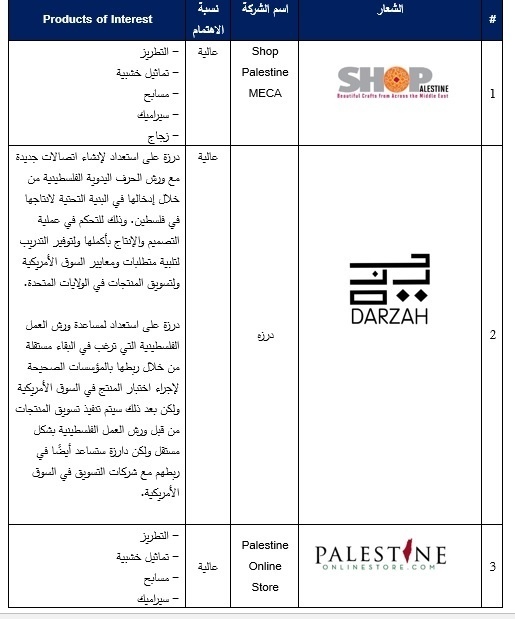 من المهم أن نلاحظ أن معظم الشركات ادناه شركات غير ربحية وتميل إلى تخصيص عائداتها لمشاريع تنموية في فلسطين. Products of Interest نسبة الاهتمام اسم الشركة # - التطريز - تماثيل خشبية - مسابح - سيراميك - زجاج عالية Shop Palestine MECA 1 درزة على استعداد لإنشاء اتصالات جديدة مع ورش الحرف اليدوية الفلسطينية من خلال إدخالها في البنية التحتية لانتاجها في فلسطين. وذلك للتحكم في عملية التصميم والإنتاج بأكملها ولتوفير التدريب لتلبية متطلبات ومعايير السوق الأمريكية ولتسويق المنتجات في الولايات المتحدة. درزة على استعداد لمساعدة ورش العمل الفلسطينية التي ترغب في البقاء مستقلة من خلال ربطها بالمؤسسات الصحيحة لإجراء اختبار المنتج في السوق الأمريكية ولكن بعد ذلك سيتم تنفيذ تسويق المنتجات من قبل ورش العمل الفلسطينية بشكل مستقل ولكن دارزة ستساعد أيضًا في ربطهم مع شركات التسويق في السوق الأمريكية. عالية درزه 2 - التطريز - تماثيل خشبية - مسابح - سيراميك - زجاج عالية Palestine Online Store 3 تهتم ديرة بمنتجات التطريز مثل الثوب والمجوهرات وغيرها عالية ديره 4